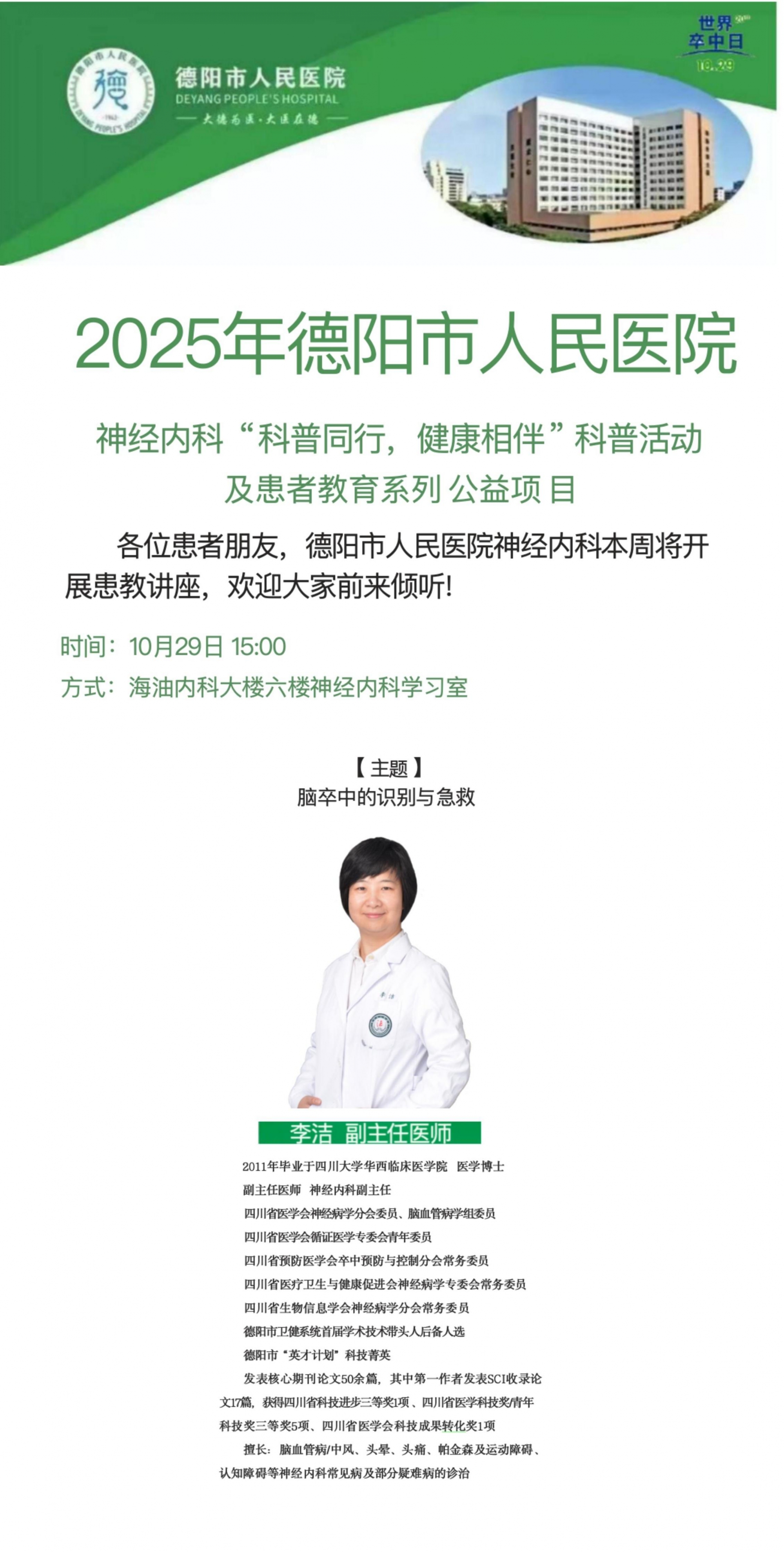 各位患者朋友,為了幫助您了解與健康相關(guān)的預(yù)防、治療和康復(fù)措施,以便促成大家的自我保健意識,德陽市人民醫(yī)院神經(jīng)內(nèi)科將在2025年每月繼續(xù)開展“科普同行,健康相伴”科普活動及患者教育系列公益項(xiàng)目講座,歡迎大家前來傾聽!