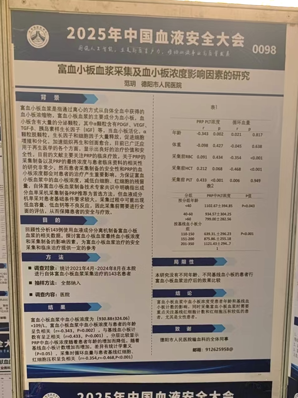 會(huì)上,德陽(yáng)市人民醫(yī)院輸血科范玥投稿的“富血小板血漿采集及血小板濃度影響因素的研究”作壁報(bào)展示;鄒玉投稿的“血液病患者血小板輸注療效的影響因素分析及預(yù)測(cè)模型構(gòu)建”作壁報(bào)展示,鄒玉在大會(huì)循證輸血專(zhuān)題作“血液病患者血小板輸注療效的影響因素分析及預(yù)測(cè)模型構(gòu)建”口頭報(bào)告。