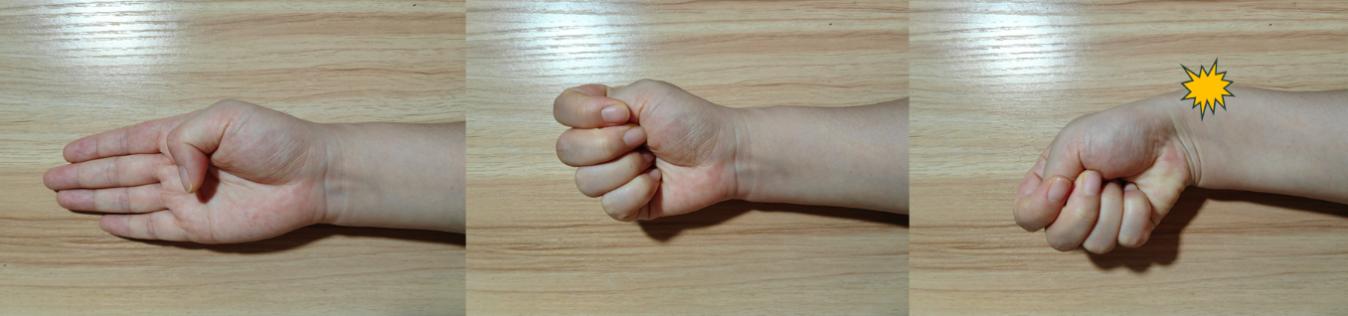 手心向上放在桌面上,拇指內(nèi)收彎曲,其余四指握住拇指,緊貼桌面,手腕向小指那一側(cè)彎曲,如果出現(xiàn)手腕疼痛,則提示可能是“媽媽手”,如圖所示。