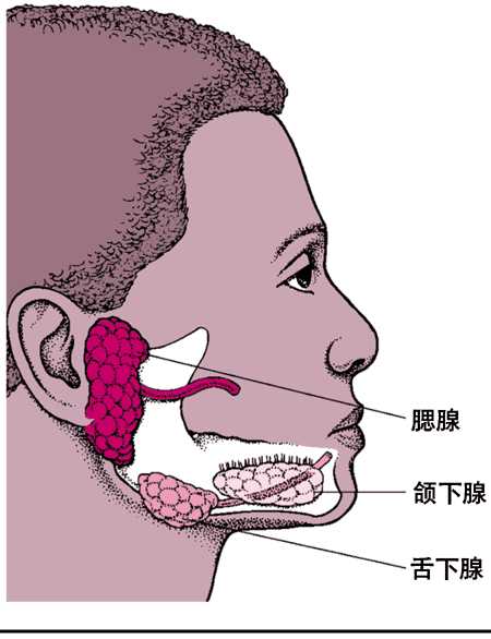 腮腺: 位于耳朵下方,是最大的唾液腺。