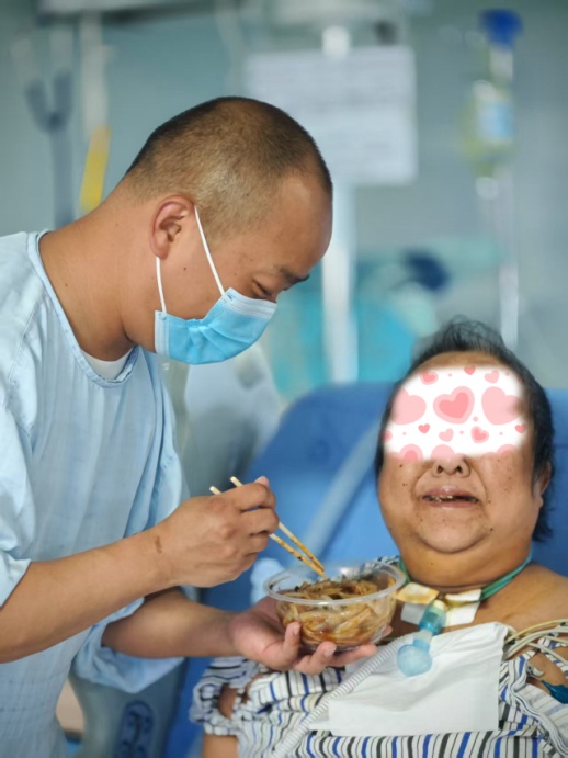 200多個日日夜夜里,醫(yī)護團隊與茜姐一同創(chuàng)造著奇跡:為應對大便失禁,大家想到了新型肛管保護她的皮膚,兒子眉頭都不皺一下就在網(wǎng)上買來800元左右一個的肛管,配合醫(yī)護團隊每日護理,傷口小組協(xié)助診療、日復一日的壓瘡處悉心換藥、定時翻身、調理飲食;面對呼吸衰竭,從呼吸機輔助通氣到經鼻高流量吸氧,再到鼻導管吸氧,每一次努力,都是竭盡全力。漸漸地,茜姐能從眼神交流到用說話瓣膜暢聊,從鼻飼管流質飲食到親口品嘗家里的飯菜,從無力抬手到捧著零食追劇,從被壓瘡困擾到傷口完全愈合——她用堅韌,活成了所有人眼中的“奇跡”。